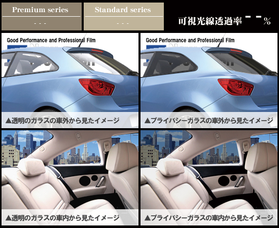 車外から見たイメージ、車内から見たイメージ、プライバシーガラスに貼ったイメージで